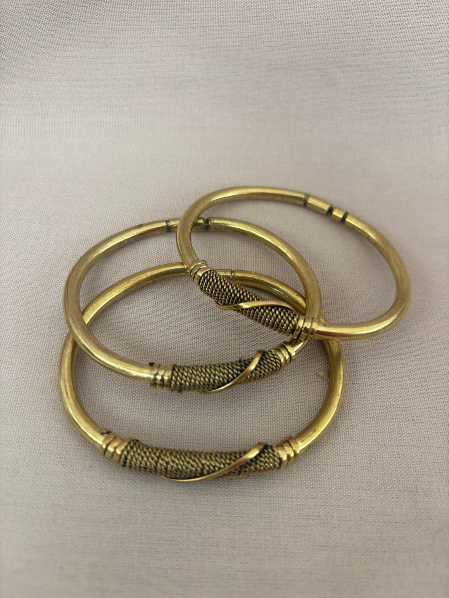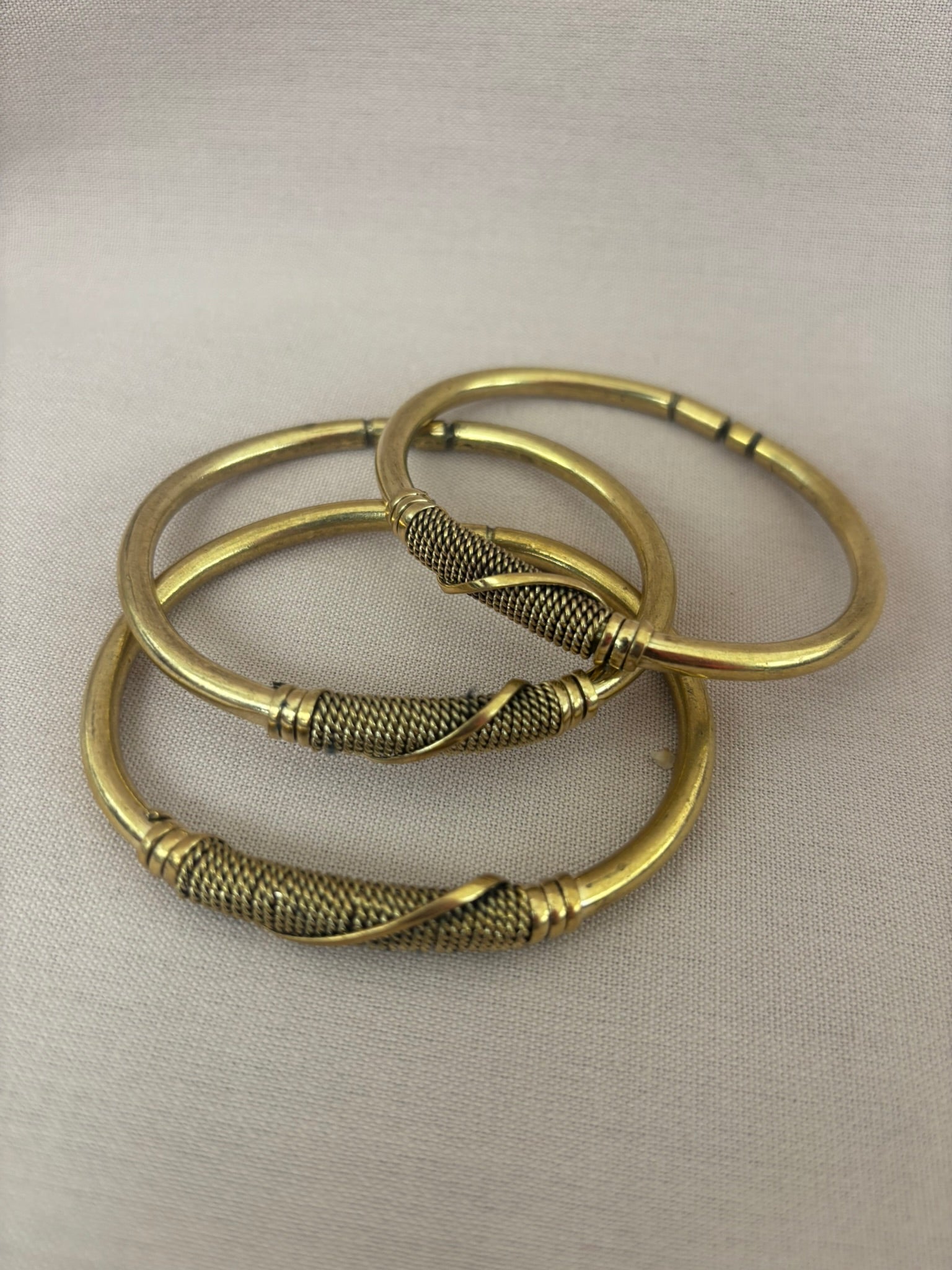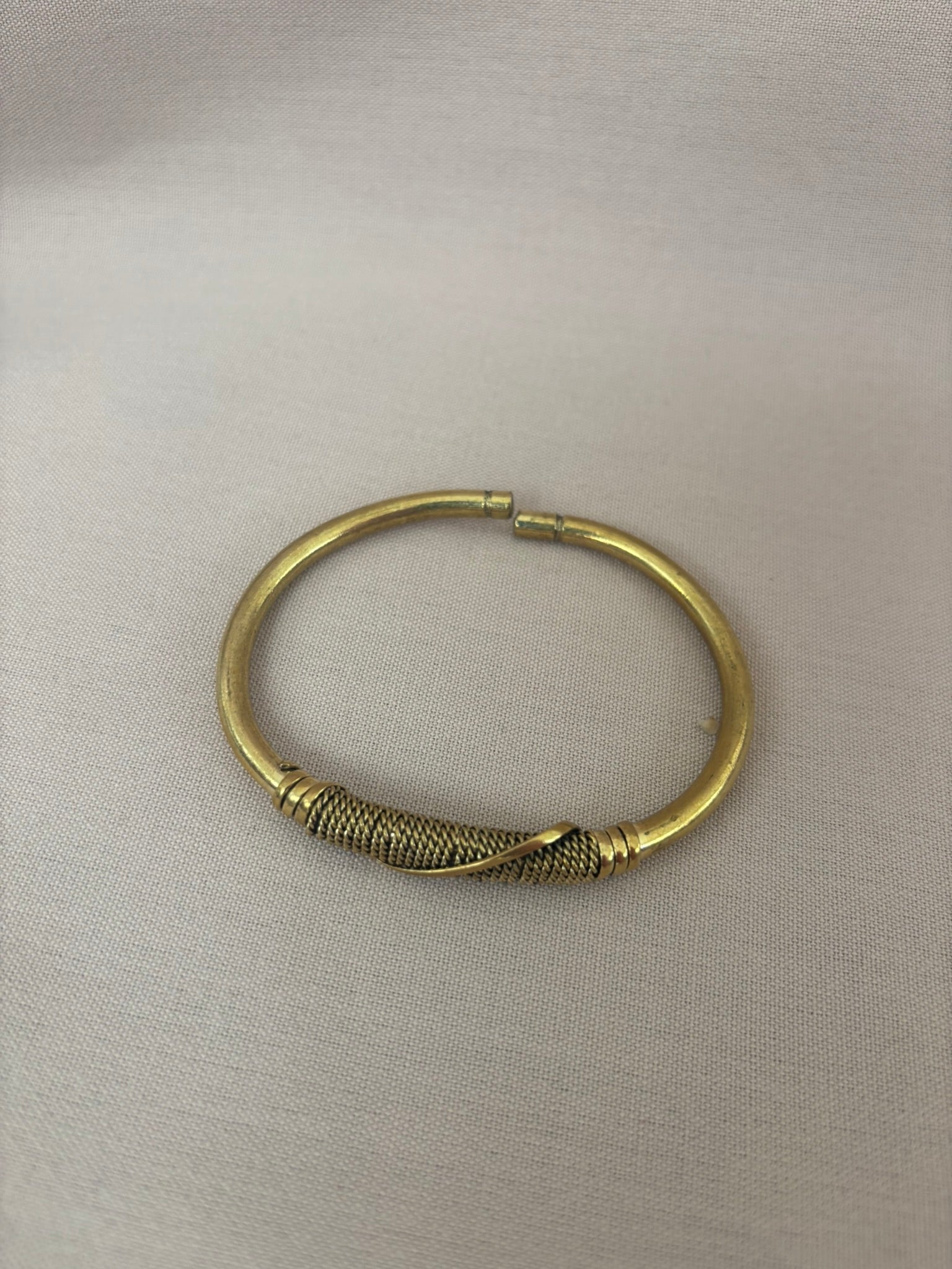 This handcrafted brass bracelet features a smooth, rounded cuff accented with a coiled brass center, creating a refined focal point rooted in tradition and artisanal design. The rich golden tone of brass brings warmth and quiet strength, while the textured coil adds depth and character.