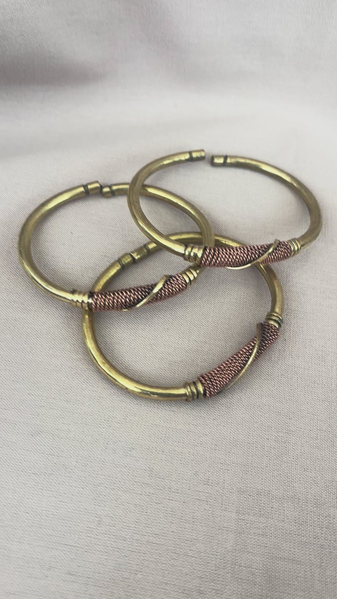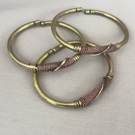 This handcrafted brass bracelet features a smooth, rounded cuff highlighted by a hand-coiled copper accent at the center, creating a beautiful contrast of warm golden and earthy tones. The coiled copper detail adds texture and depth, drawing the eye while honoring traditional metalwork techniques.