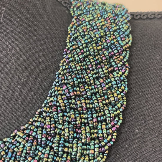 Elevate your look with the luminous beauty of this handcrafted beaded collar, woven with iridescent beads that shift effortlessly between hues of emerald, blue, gold, and deep violet. This intricate piece lies gracefully along the neckline, creating a soft, sculpted silhouette that feels both regal and modern.