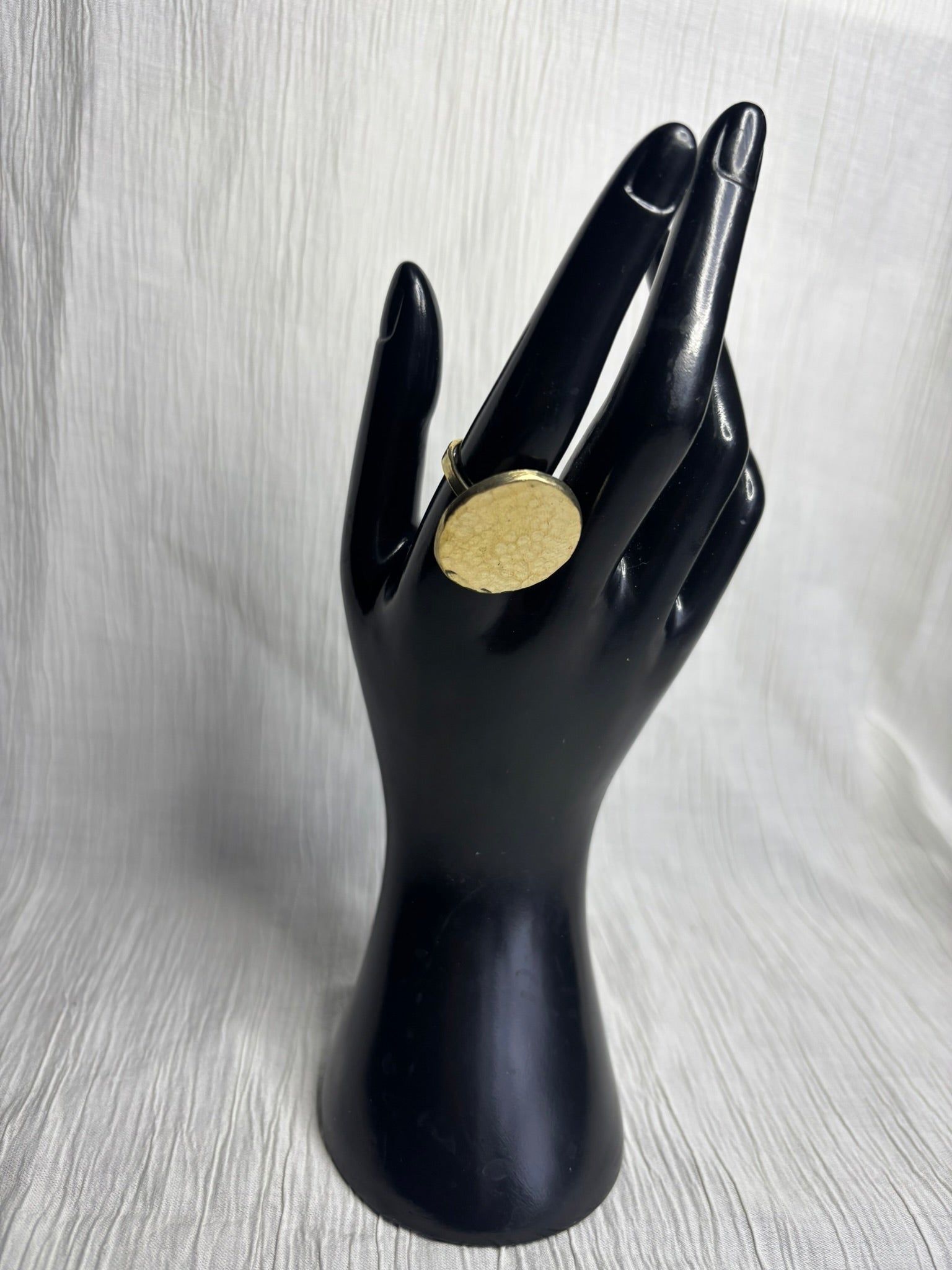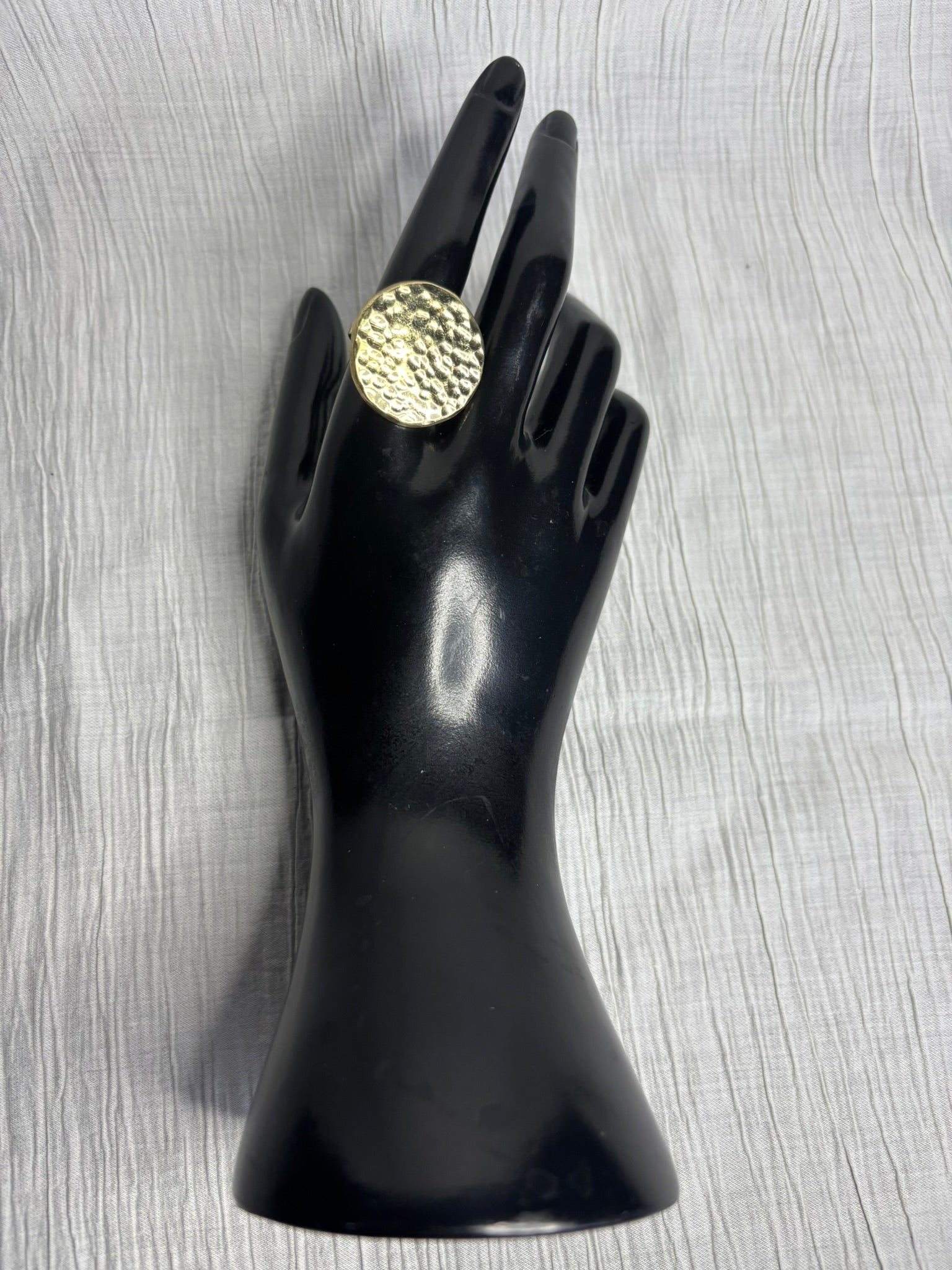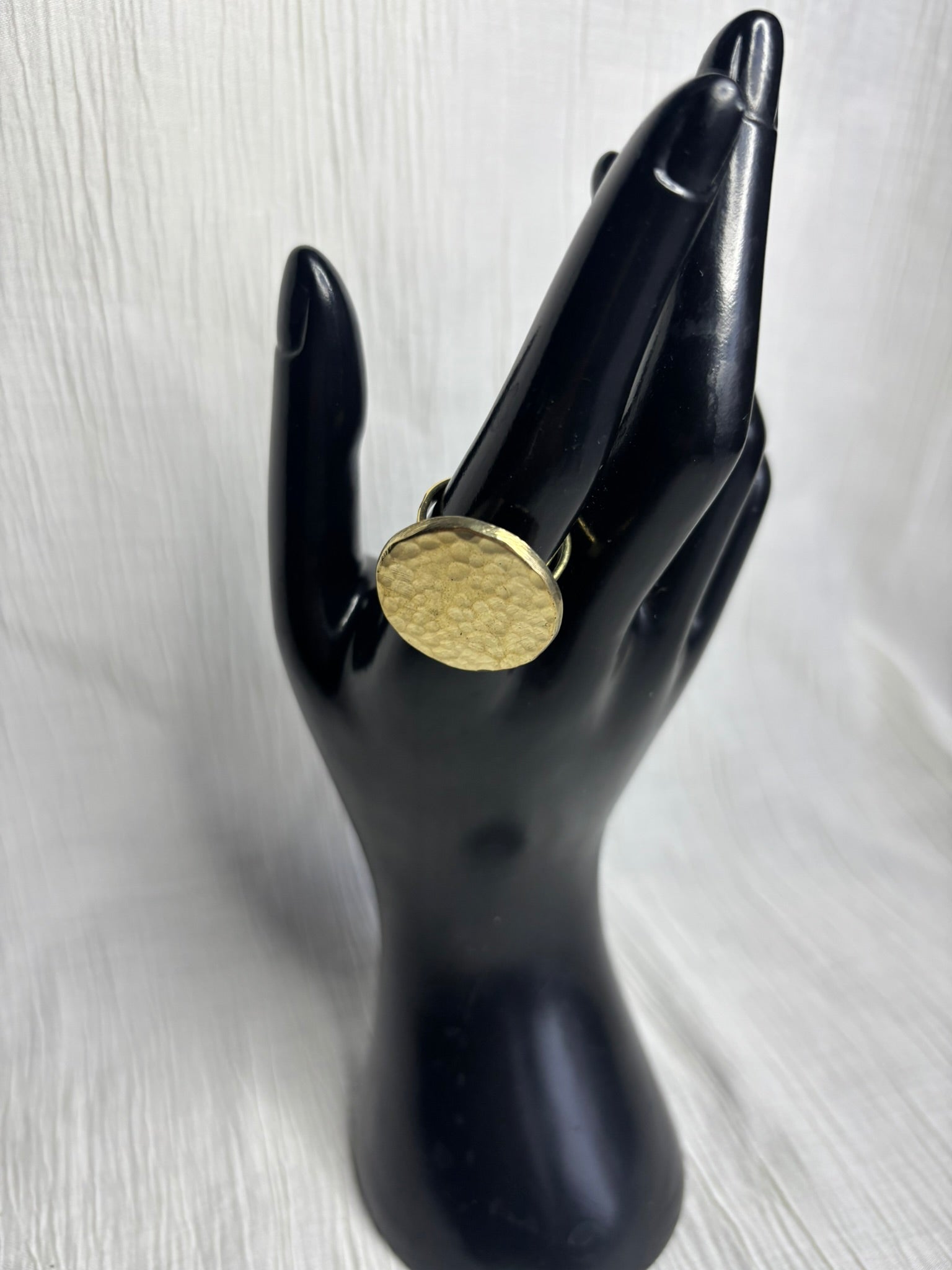 This ring is a powerful tribute to grounded femininity. Featuring a bold hammered brass disc, this ring makes a loud statement in the softest way.